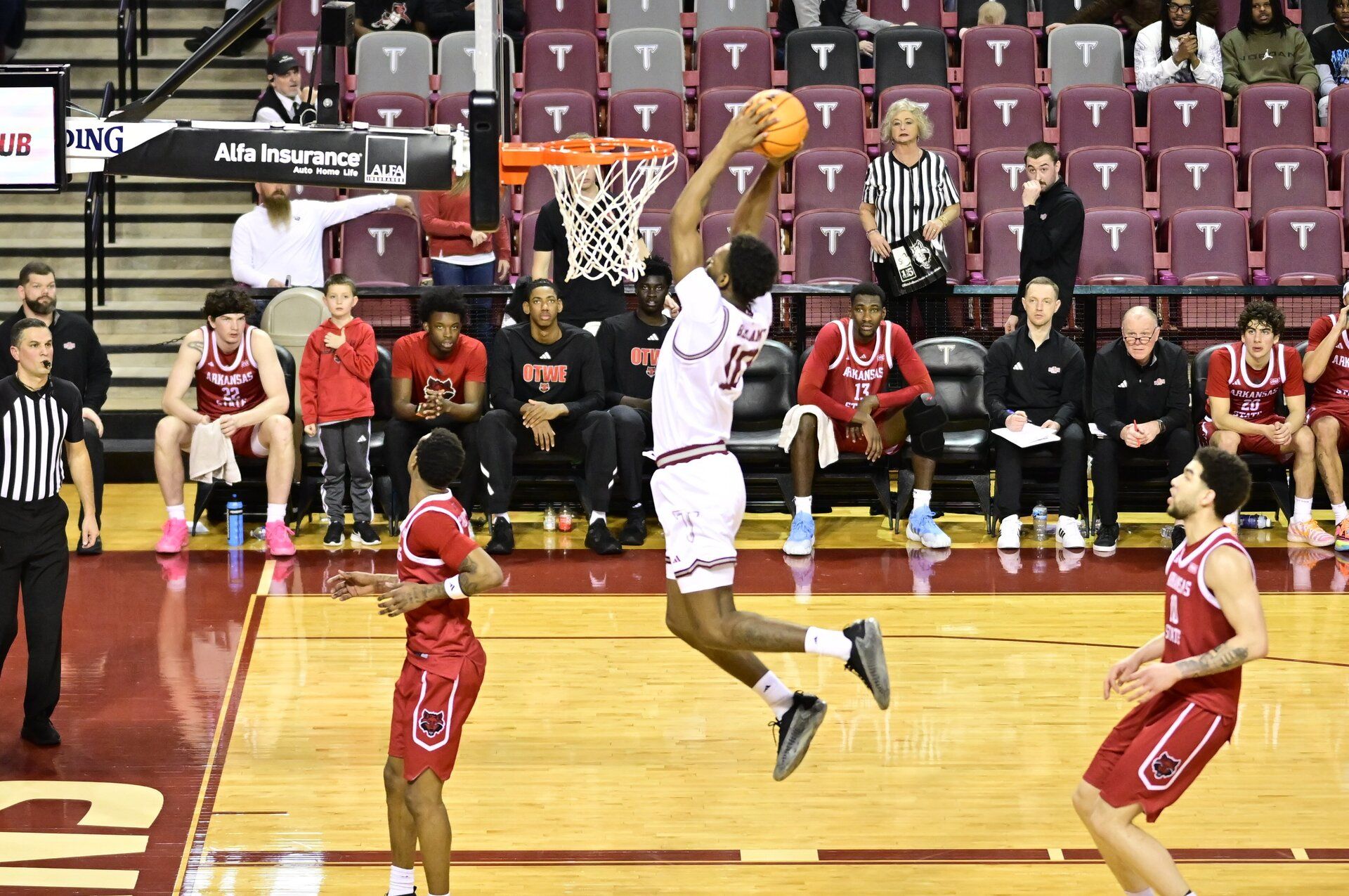 Today’s Trojan Top Performance, brought to you by Conecuh Sausage, is, redshirt senior Jerrell Bellamy of the Troy men’s hoops team, who picked a great time for his best game as a Trojan. Entering Saturday’s battle with Arkansas State, Bellamy’s previous career-high was 18 points. The Phenix City, Ala., native went 9-of-11 from the field for a new career-best of 22 points, including four rim-rocking dunks.