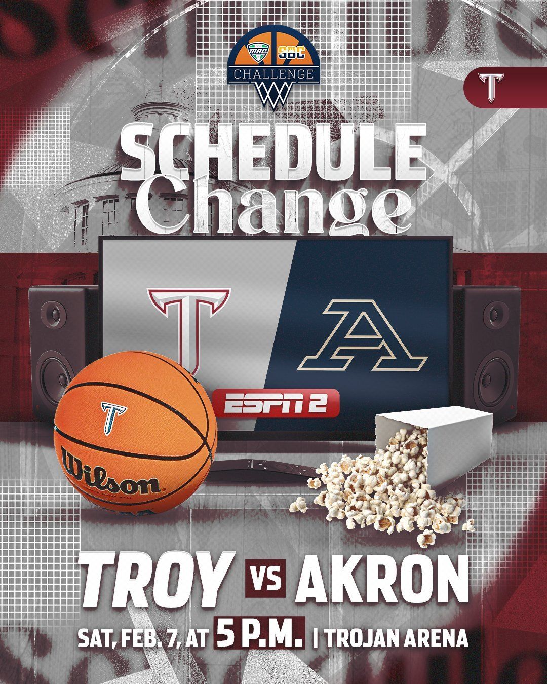 Troy men’s hoops game against Akron next month has been elevated to ESPN2 and will now be tipping off at 5 pm CT from Trojan Arena.