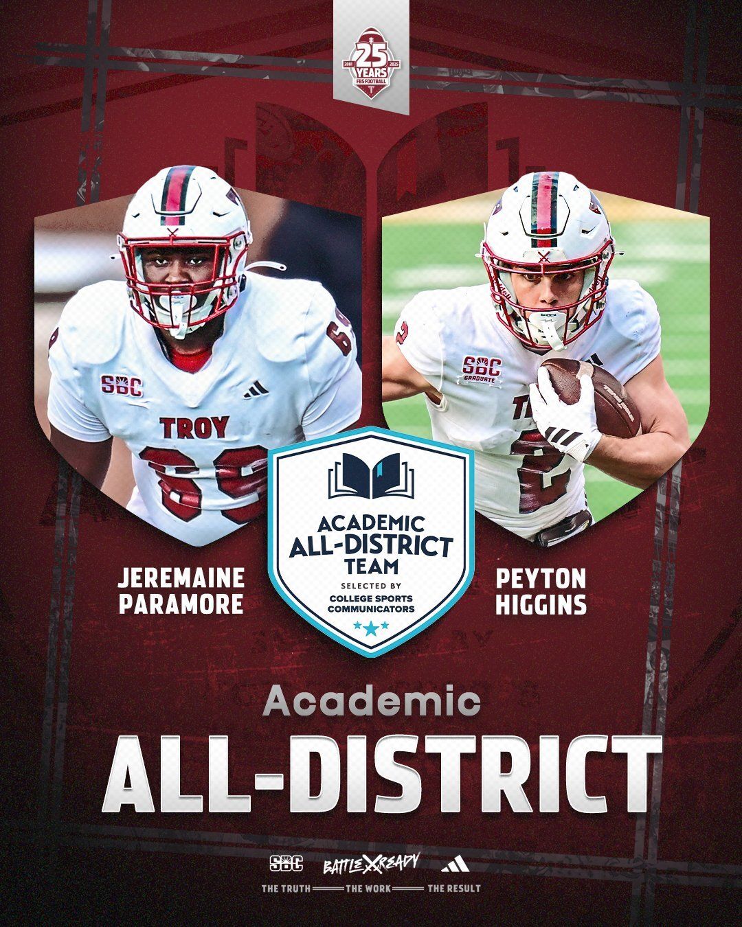 🔼 Class Acts. This week, Troy receiver Peyton Higgins and defensive lineman Jermaine Paramore were named to the College Sports Communicators Academic All-District team.