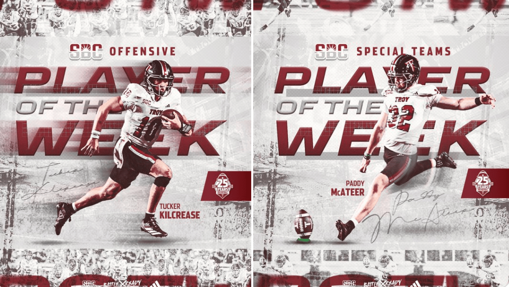 The Troy football team did exactly that with Trojan quarterback Tucker Kilcrease and kicker Paddy McAteer were named the Sun Belt Conference Offensive and Special Teams Players of the Week, respectively.